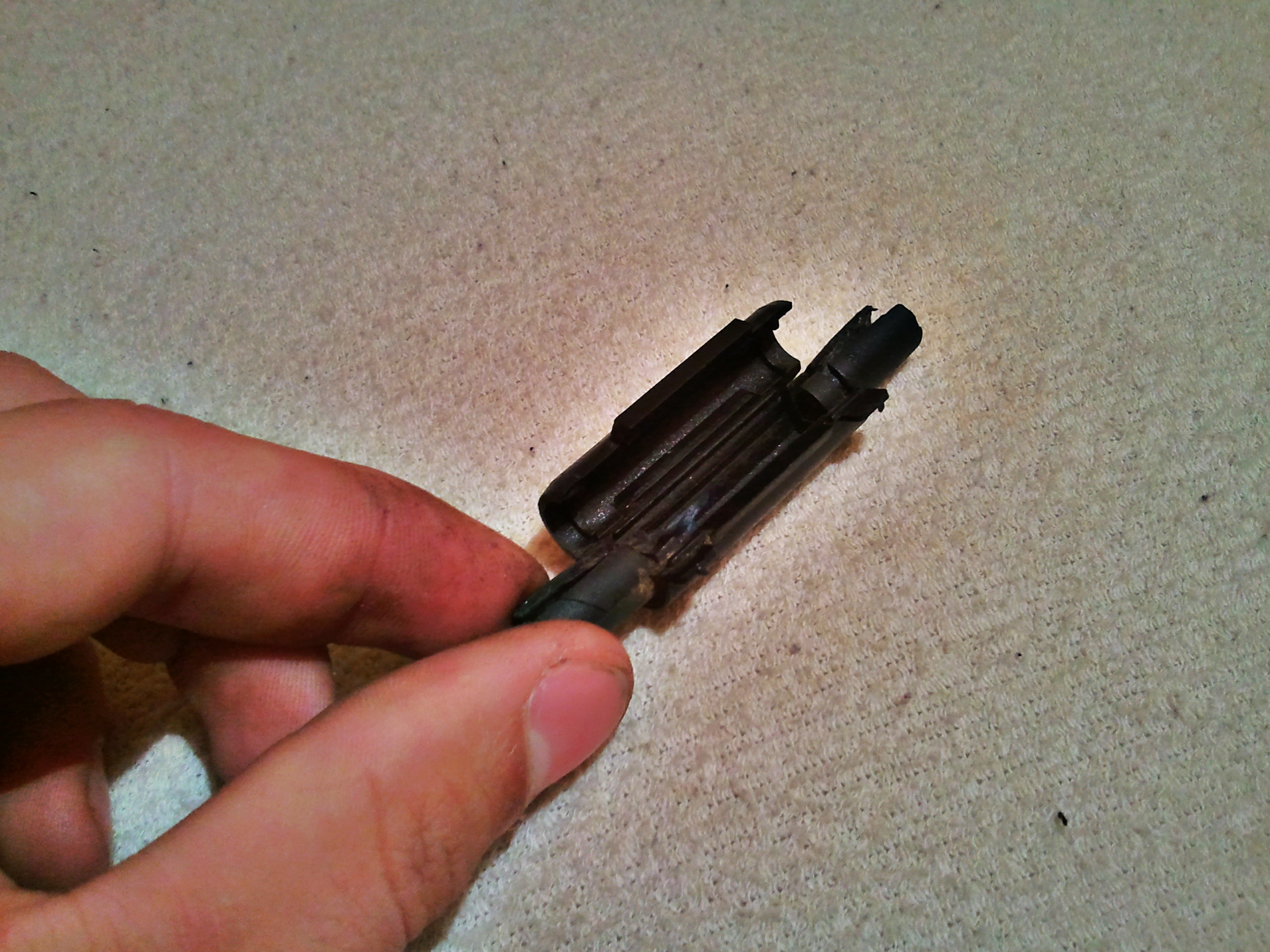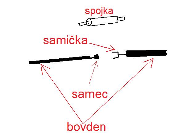 Lenže, táto spojka (ktorá tam bola mimochodom aj doteraz) je príliš malá. Okrem toho že moje lanko je spojené čokoládkou od karburátora k lanku, je rozdelené ešte na ďalšie dve časti . Prvá časť lanka je normálne "navinutá" priamo na slimákovi v rukoväti, a končí niekde po 40cm ako samec ("gulička") a druhé lanko má na začiatku "samičku" to ktorej sa ejdnocucho vloží táto gulička a chytí sa to touto "spojkou" .. aby sa BOVDENY opreli o spojku a vovnútri koloval len samotný spoj.