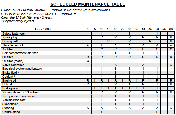 Myslim ze motor je Piaggio Quasar 300i, t.j. rovnaky ako moj a v tom pripade plati prilozena tabulka intervalov udrzby.