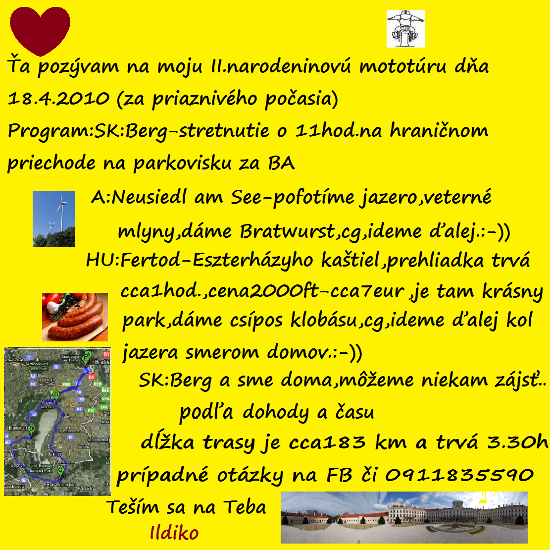 Pozývam Vás na motovýlet po SK,A a HU...kto má chuť a čas....malo by byť 21stupňov...
