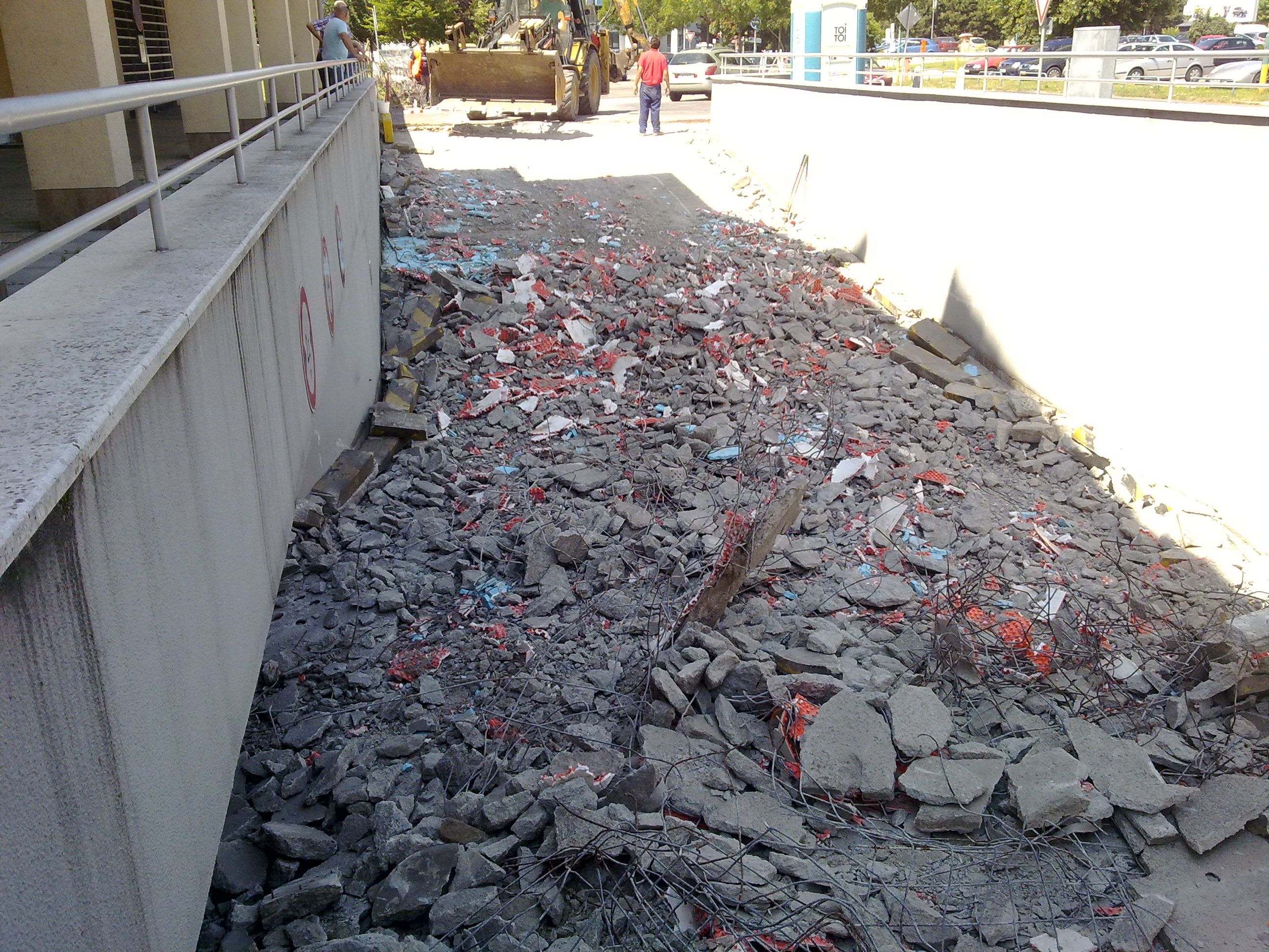 To nie je bordel zo stavby, ale zbíjačkou rozbitá samotná betónová cesta aj s podložím aj s vykurovacím roštom. Kvôli tomu roštu sa to opravuje, lebo v zime by sa tam už nedalo ísť bez pokazeného vykurovania. Teda dalo, ale pri námraze rovno do steny.