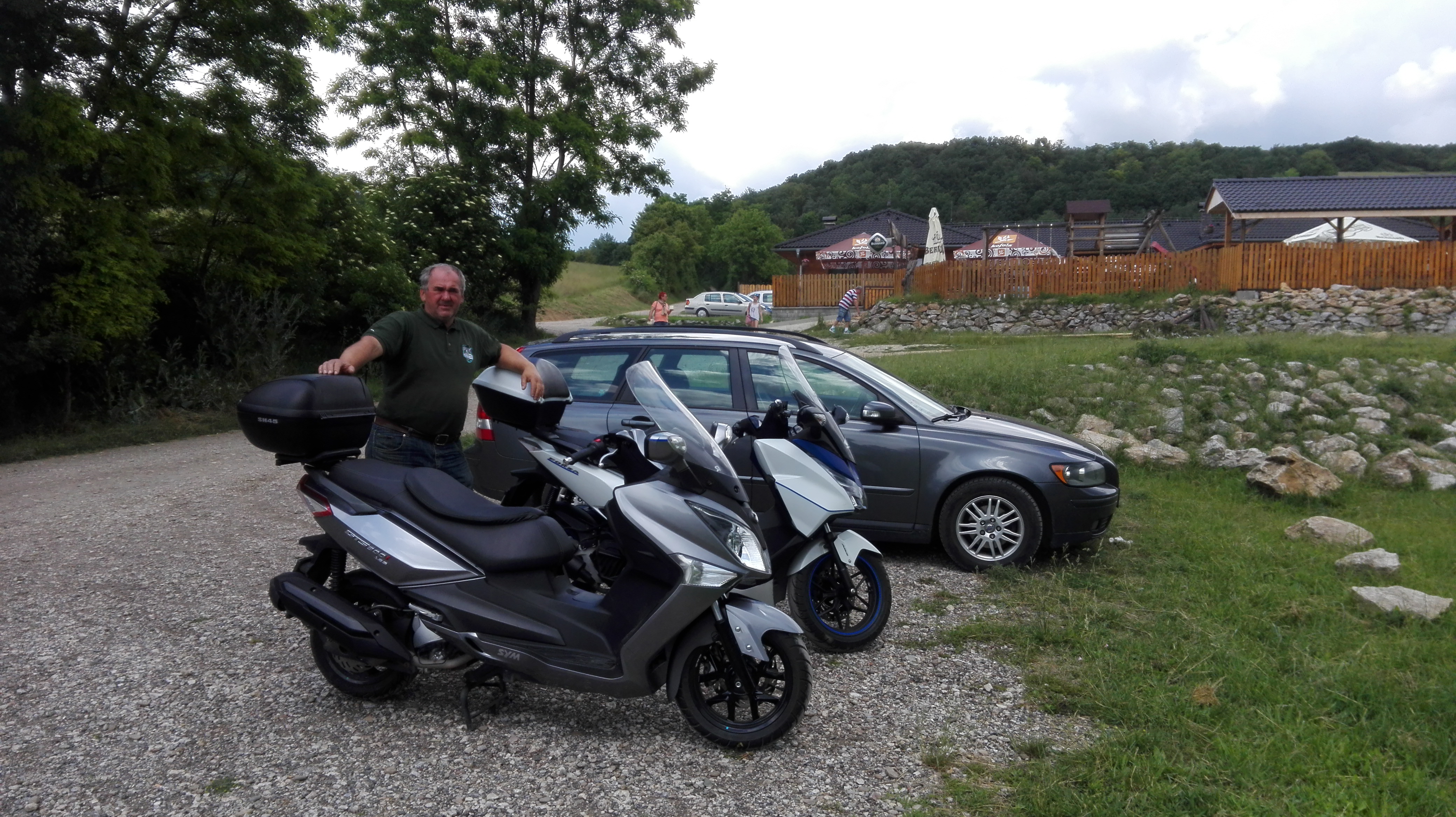 Dnes sme sa išli s Tondom trochu prevetrať bolo pekne svietilo slniečko tak som volil šušťaky šli sme cez Nitrianske Rudno kde sme spozorovali že to asi nebude dobrá voľba lebo v smere našej jazdy bolo vidieť že asi zmokneme otočili sme stroje smer Nováky a potom Topoľčany a potom smer Beckov,kde vypadalo byt bez mrakov. Ustavili sme sa teda na salaši Stiborov dvor kde sme si trochu zajedli a potom sme pokračovali domov. No Tondo to zobral cez Tr.Jastrabie a ja som pokračoval smer Bánovce za obcou Svinná ma chytil taky lejak ze som premokol do nitky a pri motoreste Delta som to vzdal potom prišla manželka na aute a priniesla mi nepremok a pokračoval som potom v jazde domov je zaujímavé že o 2km. nebolo známky po daždi až domov a ja mokrý ako pes. Od teraz stále nepremok zo sebou.