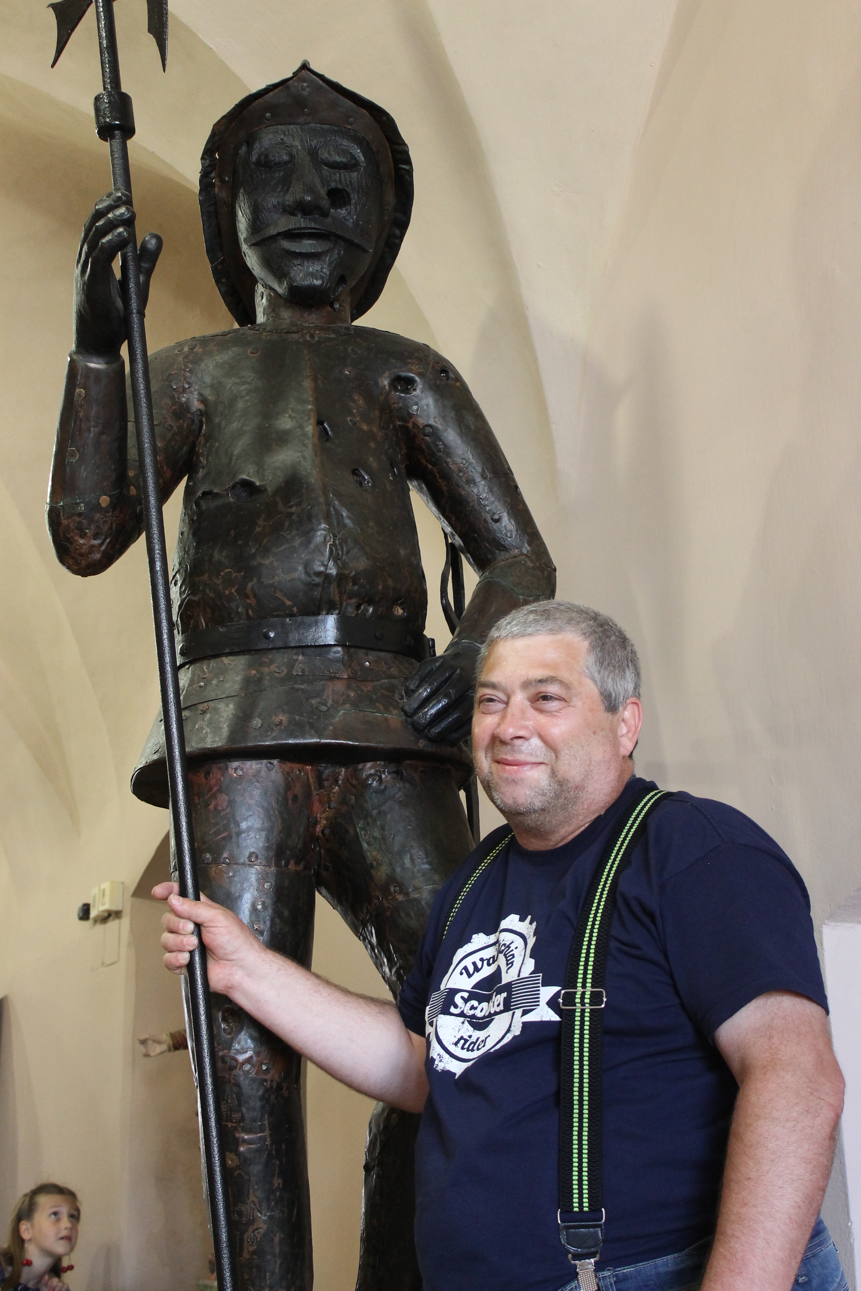 Potom prišlo stretnutie s chlapcami spoza kopca na križovatke za Kráľovou Lehotou. Nasledoval rýchly presun do Popradu, kde sa tankovalo a čakalo na Sejca a Waikika. V Prešove sme navštívili Harley klub kde pribudli do skupiny chlapci z Kočíc, dali kávu a šup ho do reštaurácii lietadlo. Po dobrom obede sa skupina presunula do Bardejova, kde sme mali dohodnutý vjazd scootrov na historické námestie. Väčšia časť skupiny sa tam zoznámila s novým obyvateľom námestia a to Bardejovským katom. No a potom ... som súhlasil so Sejcovým návrhom návštevy veže kostola. To bola chyba.