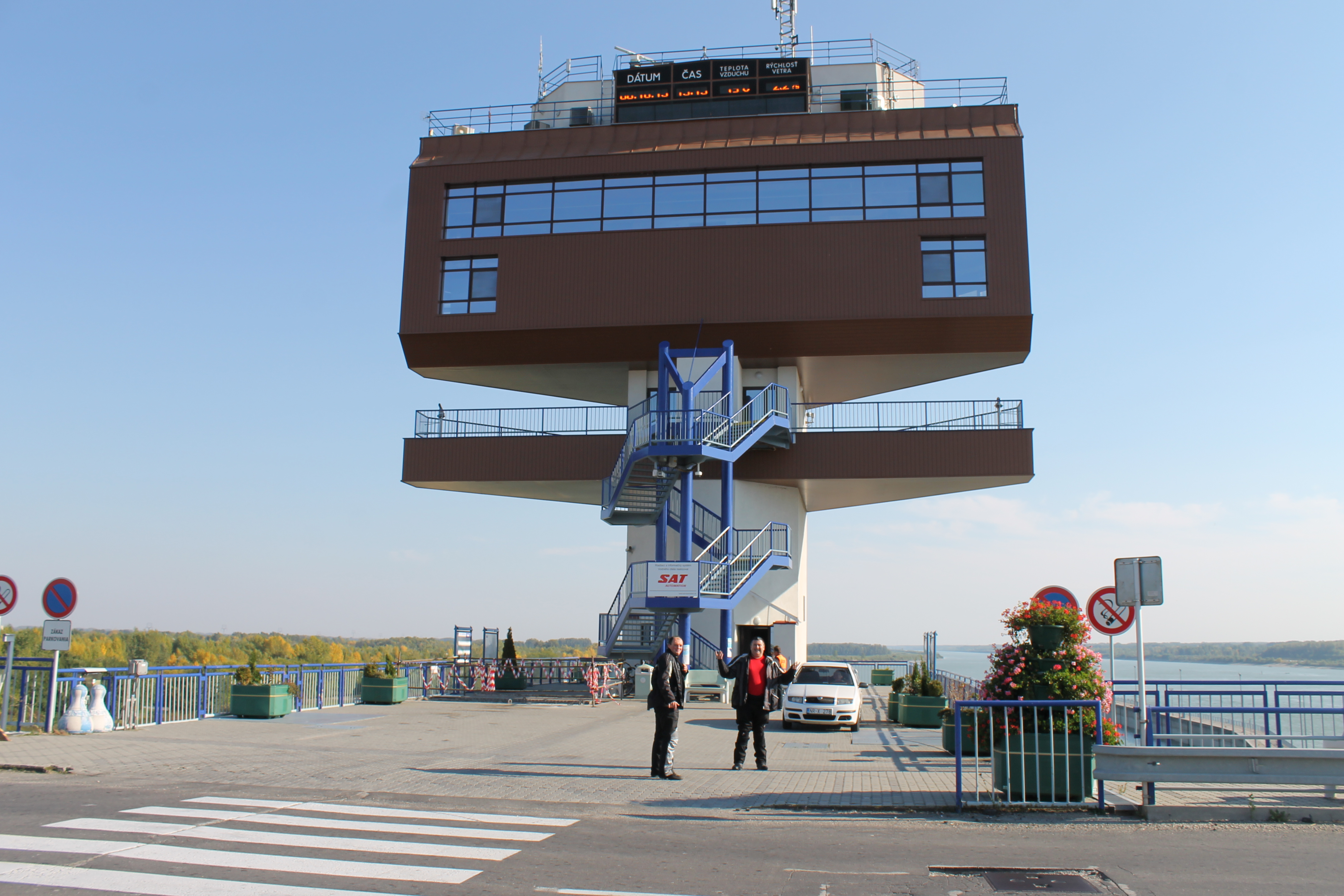 Gabčíkovo - riadiaca veža a pod ňou dvaja skútristi