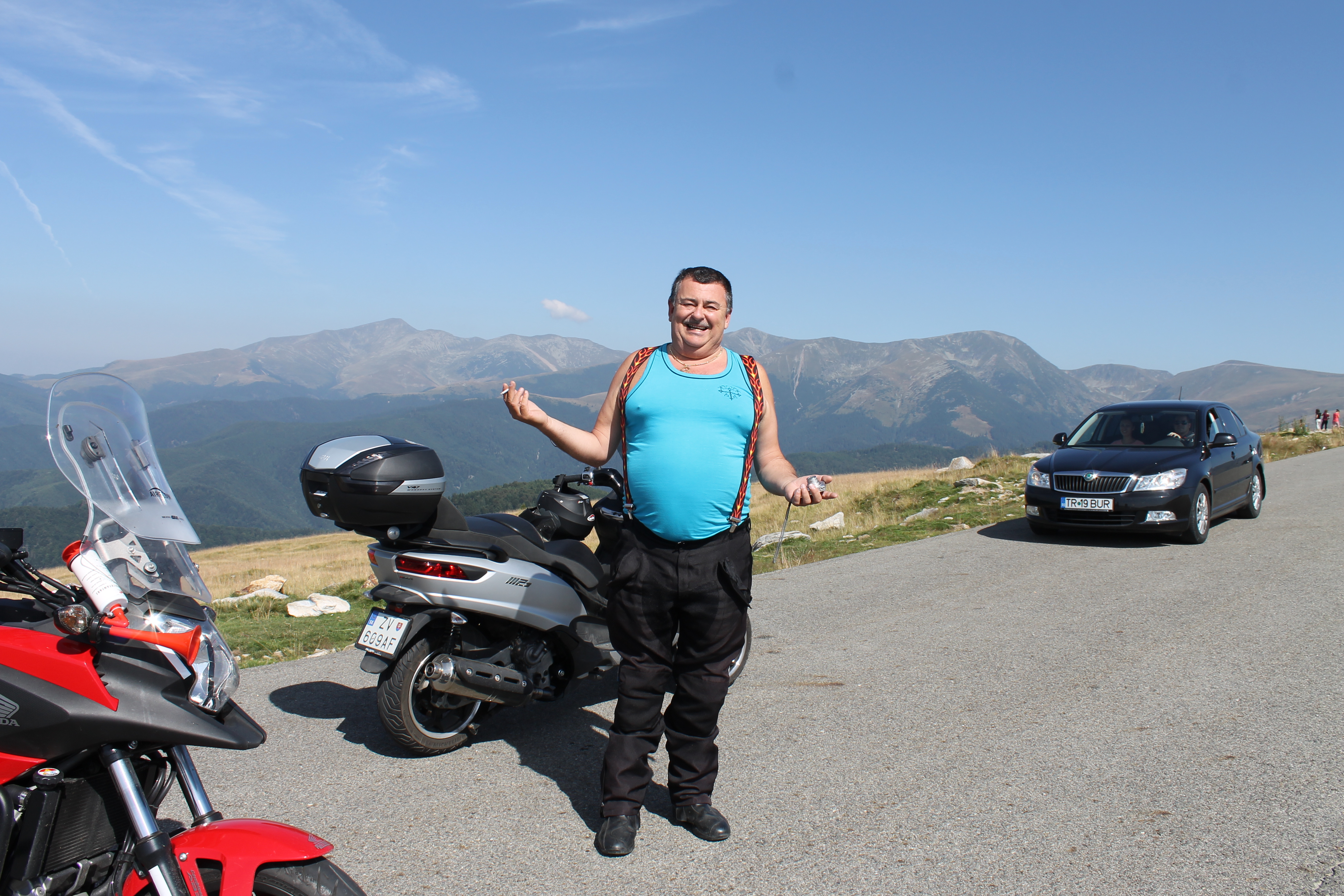 Po najlepšie strávenej noci v najkvalitnejšom ubytovaní nadišiel deň piaty. To znamenalo, že pred nami je Transalpínia. Veru že aj bola. Hneď ako sme sa odlepili od penziónu v mestečku Novaci, začalo stúpanie. Nebolo to len stúpanie, bolo to aj neskutočne veľa zákrut. Teplota v mestečku sa šplhala k 40°C, no cestou hore evidentne smerovala nadol. Keď sme zastali v hornej časti dosahovala len 18°C. Pri jedenom zastavení na fotenie ma prepadla Rumunka, ktorej sa preveľmi zapáčila MP 3 – jka. Riadne si ju vyobzerala a Igor, ktorý mal v rukách práve môj foťák nelenil a fotil. Na jednej tej foto zachytil, že nielen ona obzerala MP3 – jku, ale aj ja som skontroloval podvozok. Samozrejme že na MP3. :mrgreen: Tak ako Fagaraš, tak aj Transalpínia je čo sa týka krajiny úchvatná. Videl som veľa obrázkov aj videí z oboch pohorí, no živému pohľadu sa to nevyrovná. Proste jednoducho povedané, človek to musí vidieť a až potom si povie „Stálo to za to.“. Jedna rada pre tých, čo tam niekedy v budúcnosti zavítajú. Kým sa pustíte do kopčekov, majte nádrže plné. Možnosť čerpania PHM je tam na dosť veľa kilometrov nemožné. Po prekonaní vrcholu sa neskutočne dlho klesá. Potom dokonca aj cez zalesnené časti. V klesaní sa vyskytne cca päť alebo šesť miest, kde sa musí znížiť rýchlosť tak na 10 – 20 km/h z dôvodu zhoršenia inak nádhernej cesty. Je to na dĺžke cca 100 – 300 m. Až na jeden úsek, ktorý je dlhší. Pracujú tam aj mechanizmy. Bolo nám povedané, že vlani sa tam prehnal nejaký super dážď a došlo k veľkému zosunu pôdy a nejako sa im nedarí to od vtedy dokončiť. Piaty deň sa chýlil ku koncu a tak sme zase hľadali ubytovanie. Našli sme ho na konci mestečka Auseu. Trasa piateho dňa je tu https://goo.gl/maps/O7bFY :Bravo: