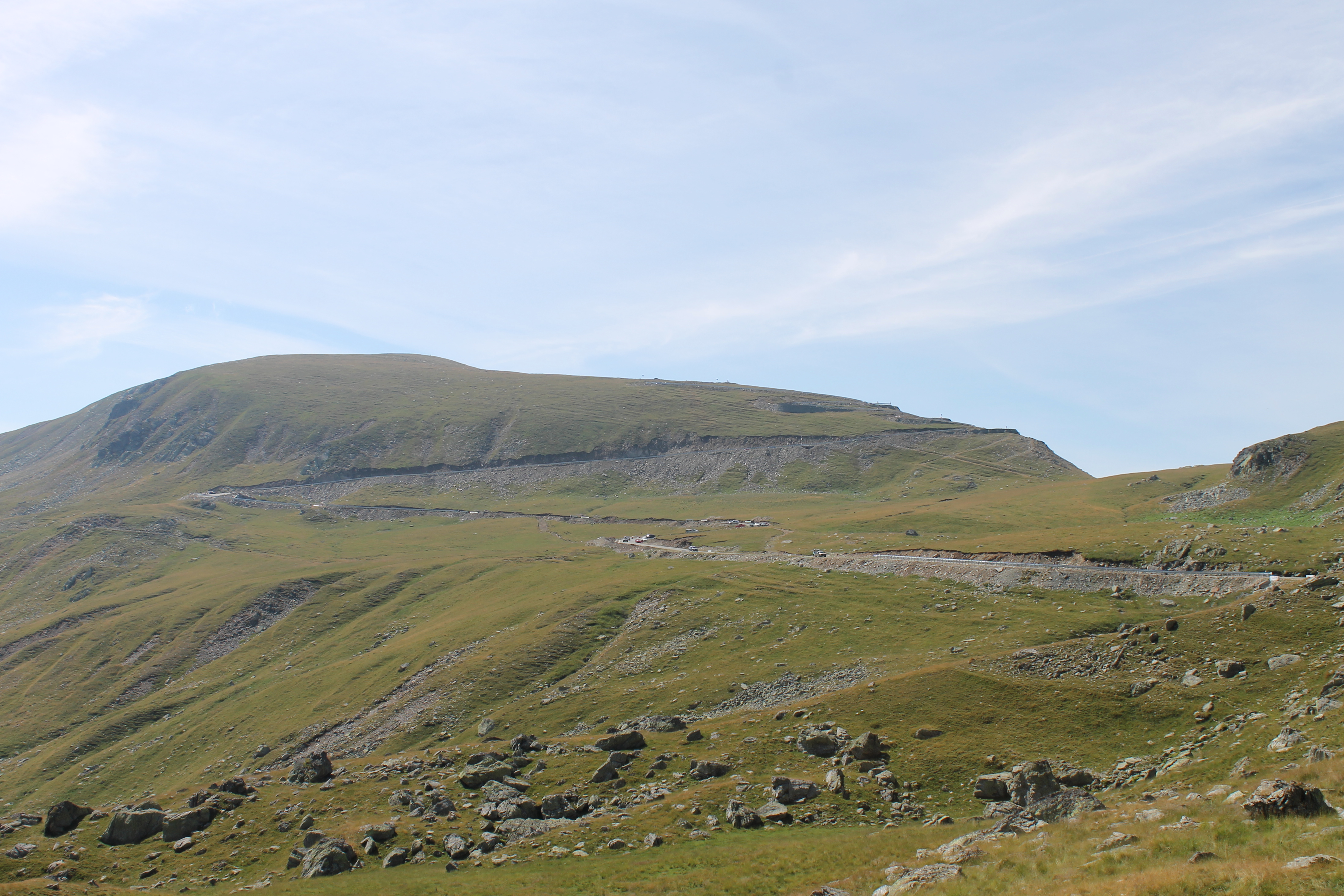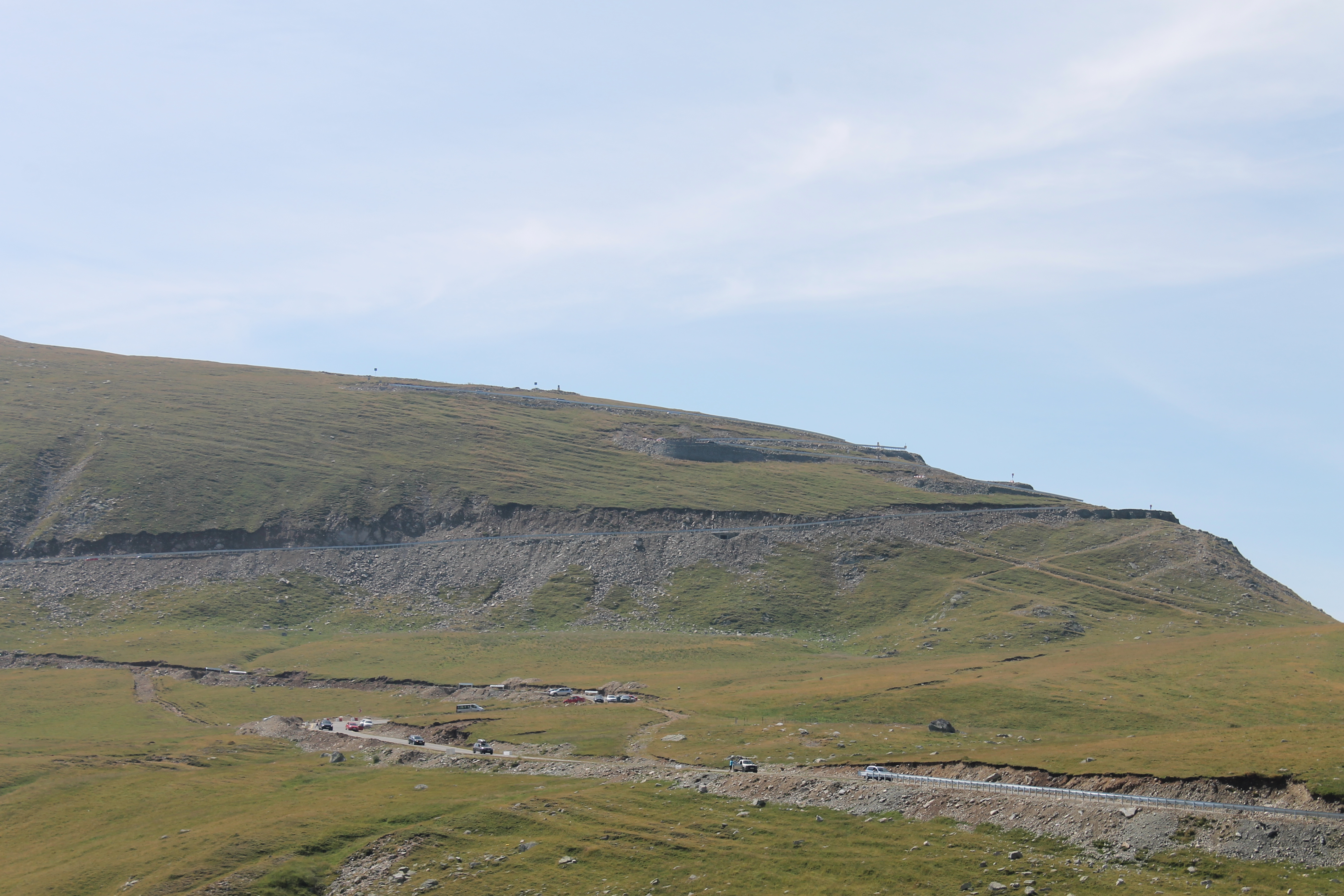 Konečne prišiel deň štvrtý, dlho očakávaný. Deň ako taký nie, ale cesta, ktorá bola pred nami áno. DN 7C – tak sa volá strategická vojenská cesta , ktorú dal postaviť bývalý šéf Rumunska Ceausescu. cesta sa kľukatí pomedzi dva najvyššie kopčeky. Jeden je Moldovean 2544 m.n.m. a druhý Negoiu 2535 m.n.m. Vraj stála strašne veľa peňazí a dokonca aj obetí na ľudských životoch, ktoré zahynuli pri jej výstavbe. Po odchode s dedinky Cartisoara sa cesta dostáva do zalesnenej časti a pomaly ale isto sa začína kľukatiť. Samozrejme žiadna rovina stále stúpanie, niekedy menšie a niekedy nie väčšie, ale riadne. Slovami sa to opísať nedá, možno áno ale ja to neviem. Proste nádhera. Po prejdení zalesnenej časti nastáva časť bez porastu. Cesta končí tunelom, pred ktorým som chcel aj zastať. Nebolo však kde. Všade plno áut a hromada ľudí, ktorí sa motali ešte aj po ceste. Čiže foto spred tunela nie je. Zato za tunelom aj vzhľadom na to, že sa tam stáť nesmelo som zastal a fotil. Igor asi nemal odvahu a pokračoval ďalej o pár kilometrov a tam ma čakal. Kľukatosť cesty ako na začiatku stúpania z druhej strany Fagarašu má podobný charakter aj na klesaní. Dokonca aj ráz krajiny je rovnaký. Najprv holé pláne a potom zalesnená časť. Po stálom klesaní sa nám po pravej strane objavuje modrastá hladina jazera, alebo lepšie povedané vodného diela (priehrada) Lacul Vidraru. cesta sa kľukatí okolo jej brehov v dĺžke vyše desať kilometrov. Vodná nádrž je zakončená polkruhovitou betónovou hrádzou, kde sa nám napriek veľkému množstvu áut a ľudí zastaviť podarilo. Po opustení hrádze naša cesta pokračovala až do mestečka Curtea de Arges kde sme zmenili smer našej púte a nasmerovali sme sa na mestečko Novaci, ktoré bolo pred ďalším z našich cieľov. Tam sme strávili aj noc. Trasa dňa štvrtého je tu