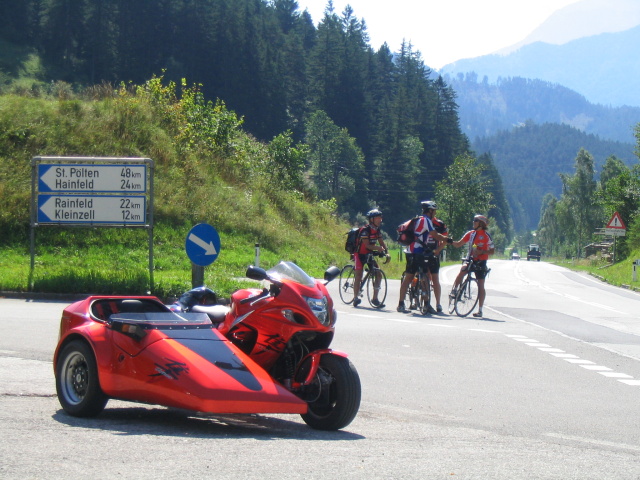 stret máme naplánovaný o 7:00 na R1 pri Seredi, dokonca sme tam skorej,takže vyrážame po D1 smer BA... na OMV pri Auparku dávame krátku pauzu na raňajky, dotankovávame do plna a dohadujeme trasu.. napriek pôvodnému plánu ísť mimo diaľnic, nás presvedčil Dukyho výrok,že na diaľnici ušetríme 2 hodiny času a tak po okreske ideme do Hainburgu,kde na Esso pumpe kupujeme diaľničnú známku a tradáá smer Wien a ďalej po A2 smerom na juh... Cesta po diaľnici utiekla jak plodová voda a my to točíme smer Pernitz... na malej pumpe za Wollersdorfom si dáme pauzu na pitie a pokračujeme pekným údolím ku Kalte Kuchl.. užívame si zákruty Rohrer Sattlu a o chvílu už parkujeme pri Kalte Kuchl... Chvílu tomu nemožeme uveriť a ako povedal Jakub - Keby mi niekto pred 2 týždnami povedal,že budem na motorke v Alpách,tak ho vysmejem :D