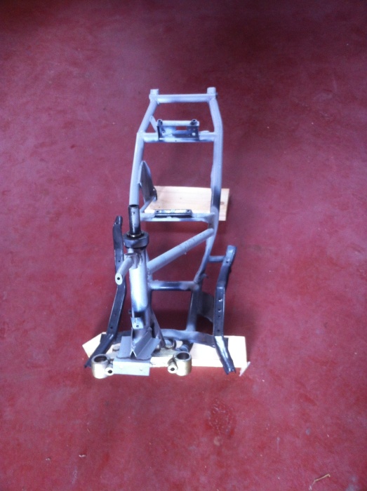 takze pred tyzdnom som bol doma, a oholil som trochu benellku o vsetky organy ktore som potreboval a dokoncil som ram, nakolko casu som mal menej jak malo, tak fotky mam iba do polovice prace, takze dalsie fotky budu az po zavodoch, zatial to vyzera ako uplne holy ram s novymi loziskami v krku riadenia, striekanie je iba zakladovkou, nieje cas :-) a este mam vlastne nastrojene riadidla, nahodenu rozperu, a napasovanu zadnu hydraulicku brzdu, nahodeny rychlopal a tak, kazdopadne to bolo na vyse 4h prace :-(