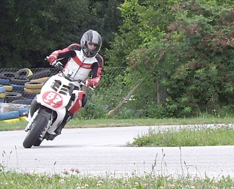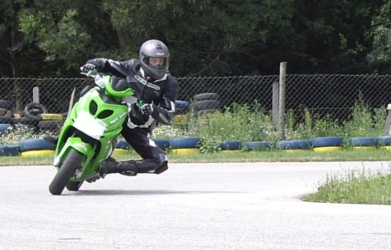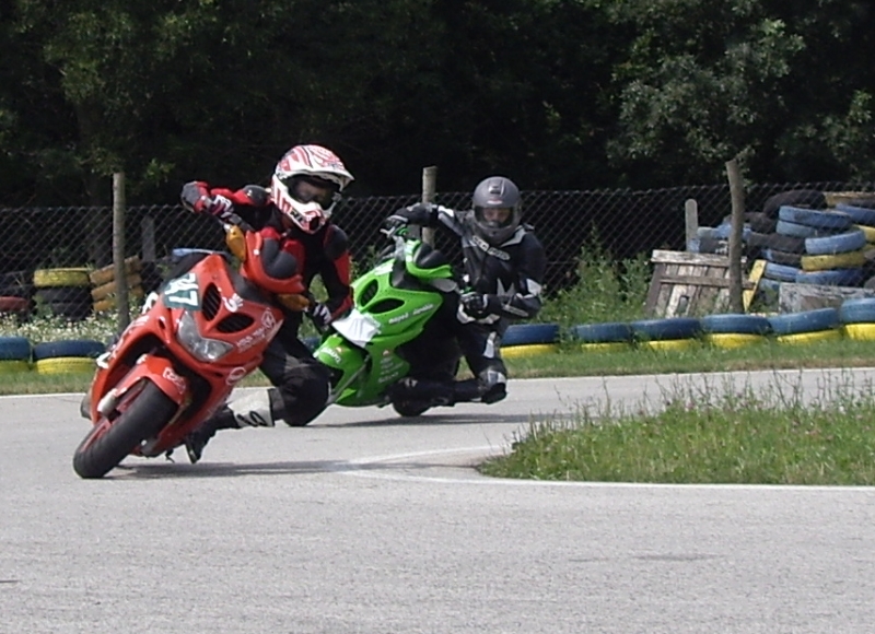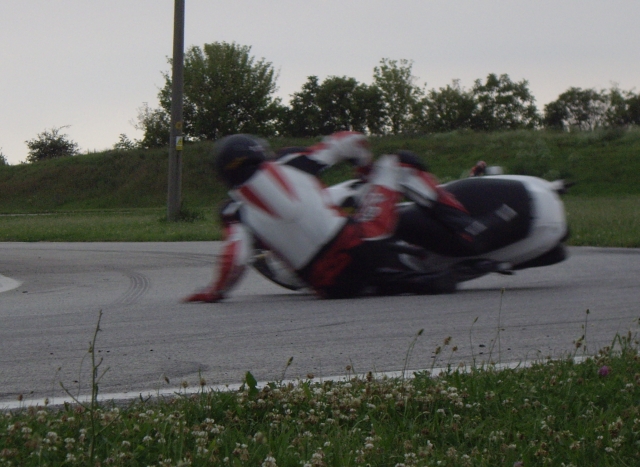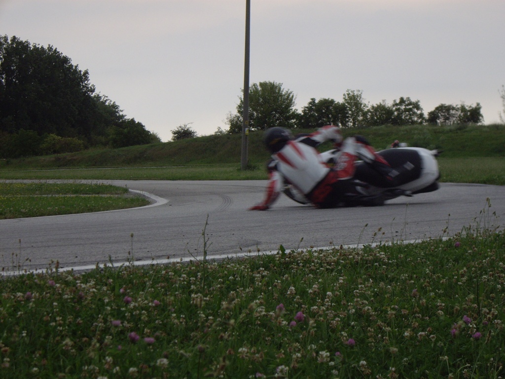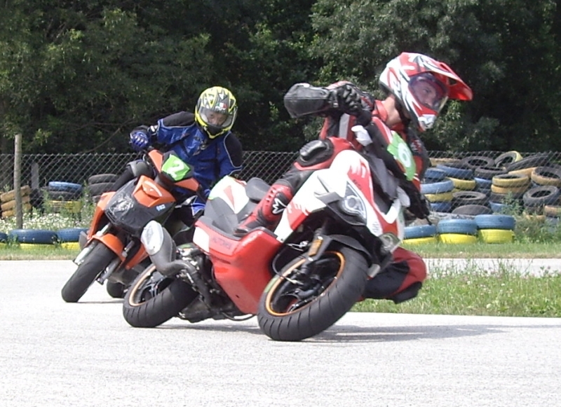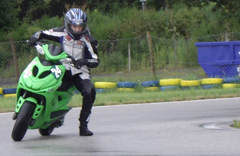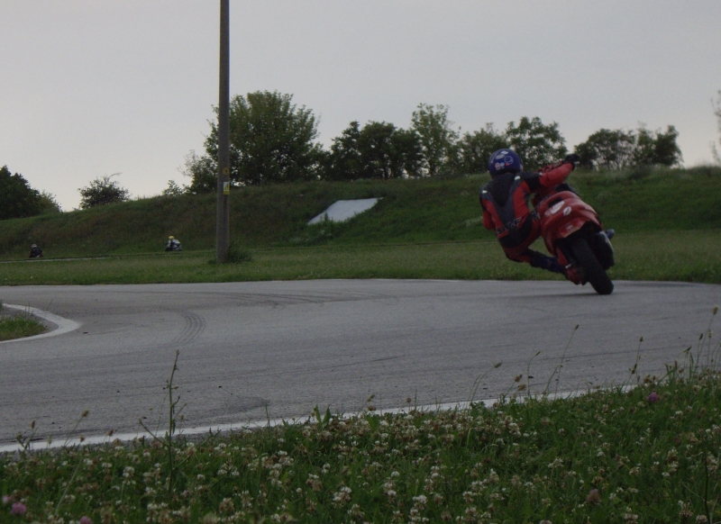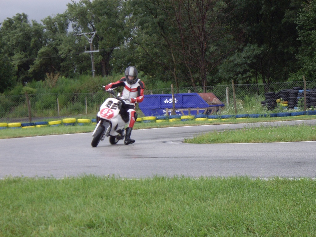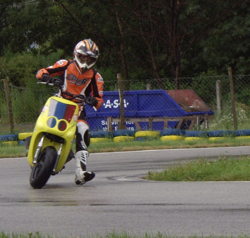 na mokrej trati sa nedalo jazdiť po dvoch kolesách a bez pomoci nohy to zákrutou ani nešlo