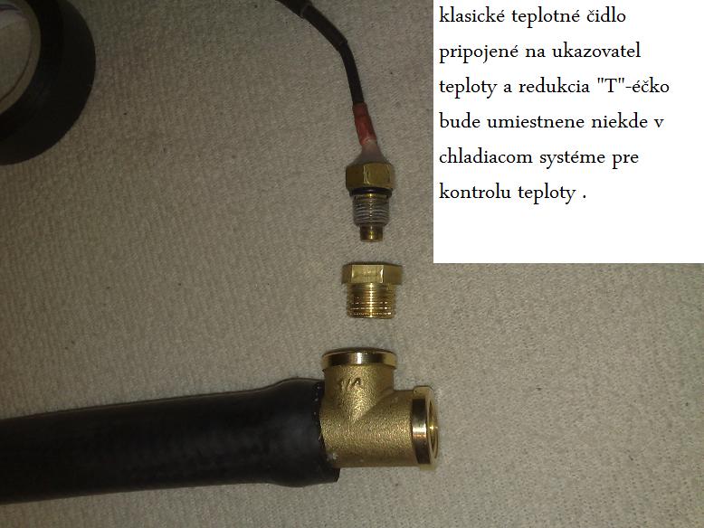 -teplotné čidlo, ktoré mi posiela údaje do normalneho KOSO teplomera nezahudím , ale vymyslel som si také "T"-éčko , ktoré vsuniem niekde čo najbližšie k motoru , zvrchu sa našrobuje teplotné čidlo, a celé Téčko sa vloží do systému /toto celé vlastne je pre kontrolu/
