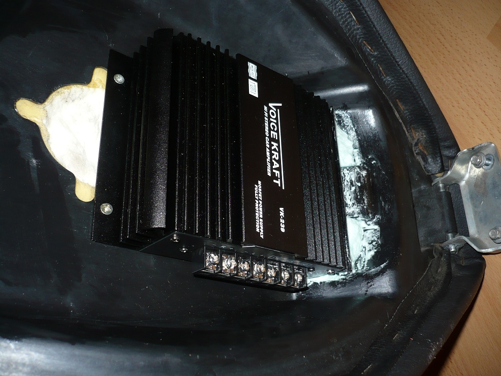 trefil jsi se , jinak zesilovač upevněn na sedadlo... (to upatlané spolu stou dírou před zesikem je montážní pěna a příjde to eště vykitovat a nejspíš tam příjde taky něco jako koženka nebo tam jenom nalepím samolepíví fólii ... eště nevím) jinak umístění zesíku je praktické a celkem to bude i pěkný až to bude potařený do nějaký látky ..