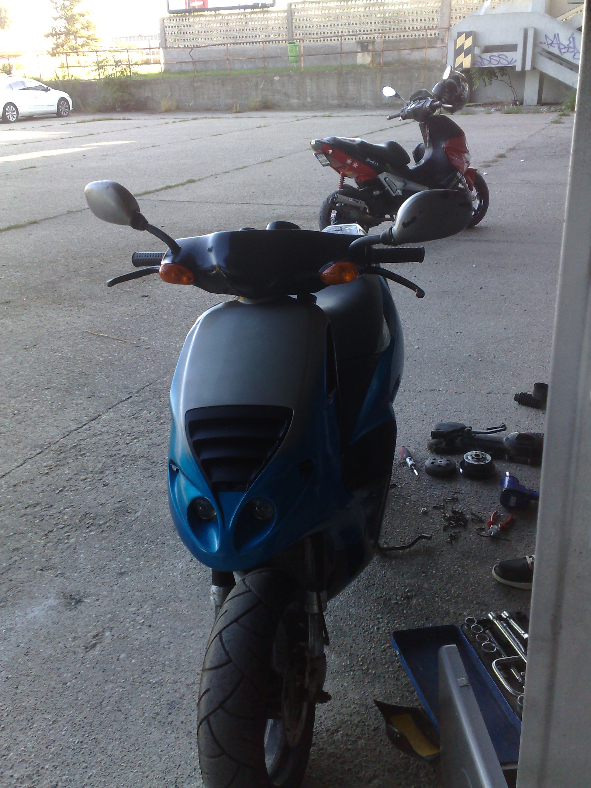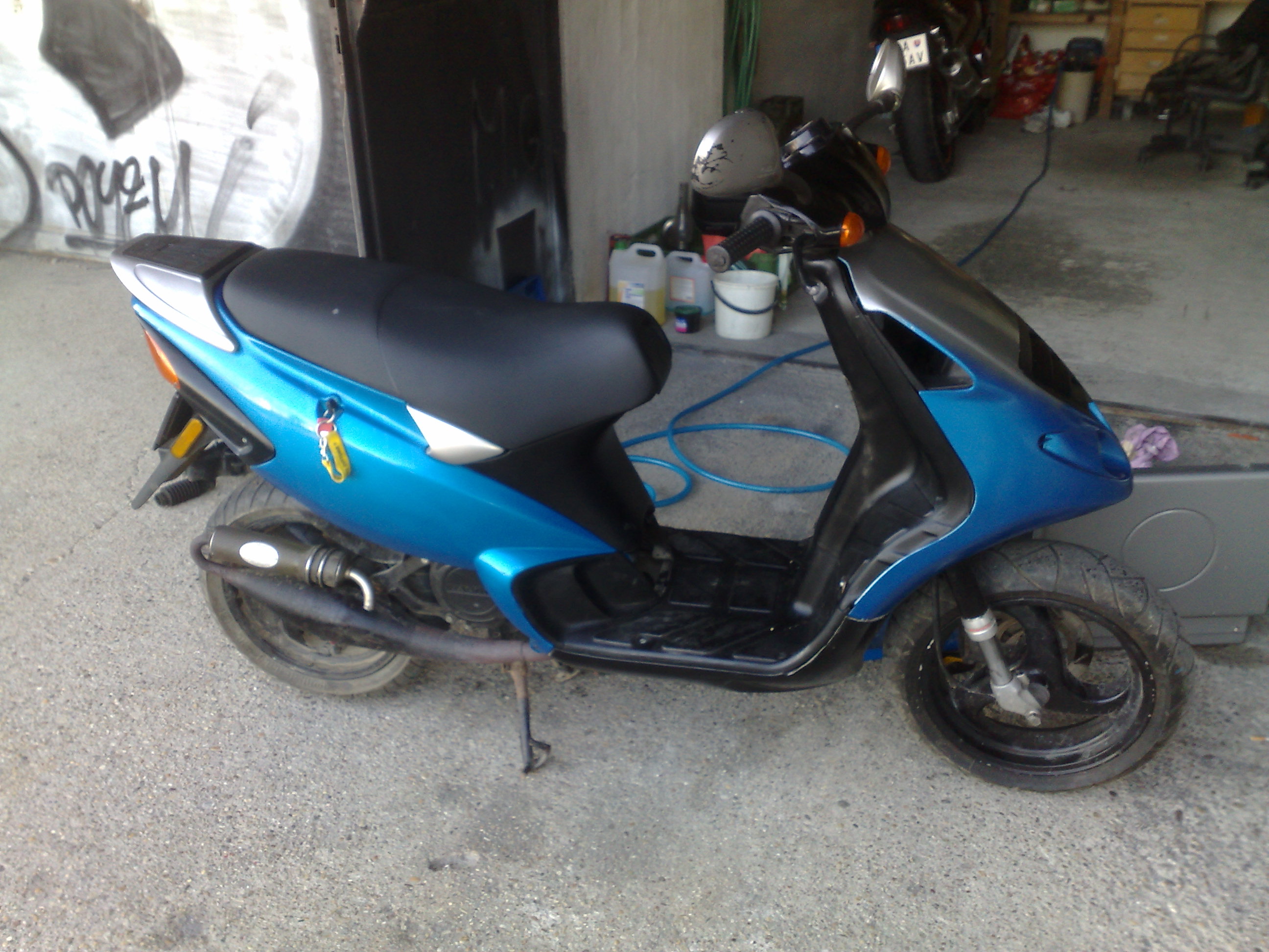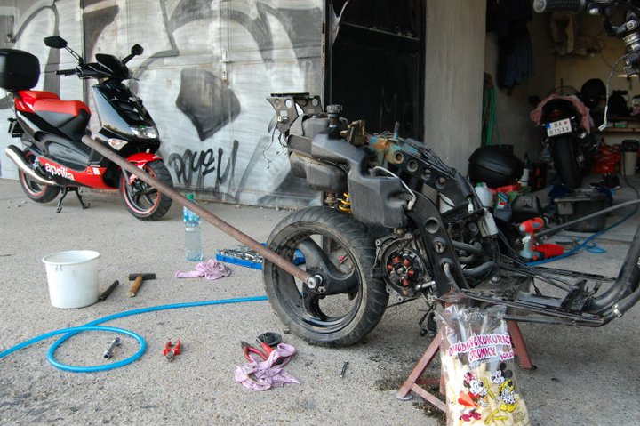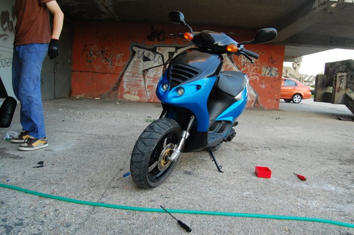 Nejake blizsie info o nom, je to rok vyroby 1997, vodou chladeny, ma to vyfuk leo vince ZX, BLOKOVANE vario, BLOKOVANE klapky, 43tisic kilometrov s povodnym valcom a aj napriek vsetkemu tomuto to ma slusnu maximalku okolo 90km/h tachometrovych (este som neskusal uplne na plny kotol a prilahnut si, pretoze ju mam len od dnes). Je inac dost v zlom stave opticky, vela plastov popukanych, farba nic moc (bude sa striekat na tmavomodru metalizu, nieco ako mal kiwi na roxovi) a proste vela prerabiek.