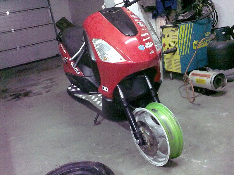 Mame tu niake novinky dnes som vysmirgloval kolesa pripravil som ich pekne na nastrek novej farby uvazujem nad cervenou alebo ciernou dosla mi guma nova takze dunlopku zo zadu som hodil dopredu a novu gumu dozadu skutrik odisiel dnes do servisu kde sa bude ladit steluuvat tuninguuvat ;)
