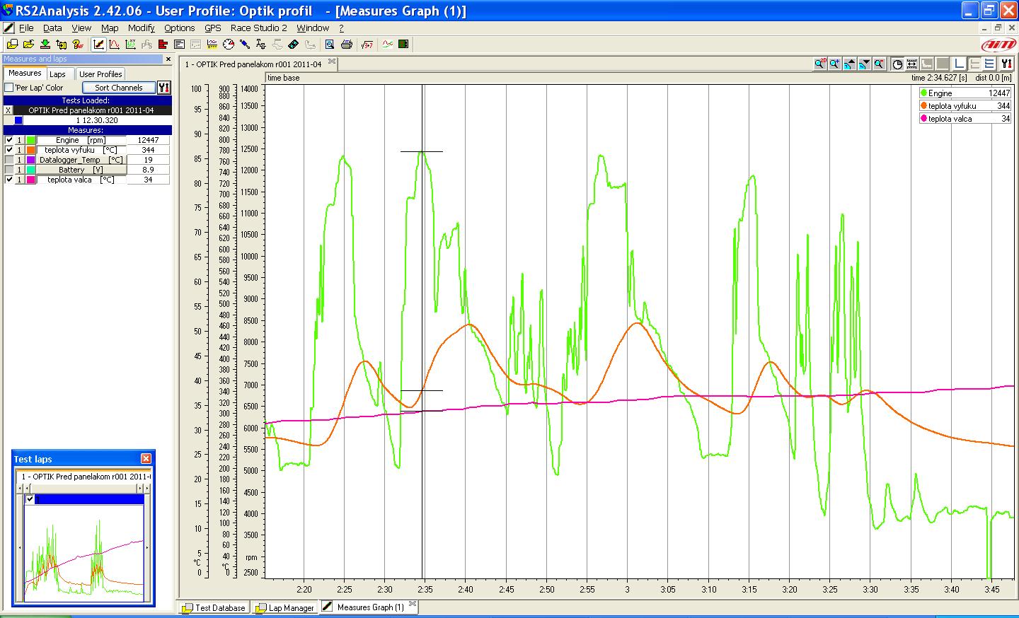 spekulantov a analyzatorov vopred upozornujem ze som jazdil na minulorocnom motore, lebo novy je este vo vyvoji, prve co som sa dozvedel bolo to ze mam zrejme velmi bohatu zmes lebo pri najvyzsom vykone teplota vyfuk. plynov dosahovala nejakych 344°C a mala by okolo 600-650 otacky ma mierne zaskocili, ale Alci ma do telefonu uistil ze som urcite nemohol ist naplno