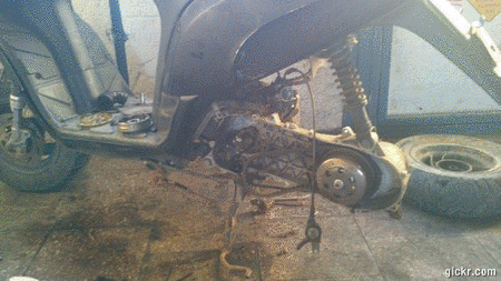 Čert nikdy nespí a nebolo tomu tak ani v sobotu, pustil som sa do menšieho rozoberania tohto pekelného zariadenia. Pozeral som stav zadných brzdových čeľustí OK (viď foto), potom som rozbehával súčasti nakopávačky a pastorku keďže mal tendenciu nevracať sa, ďalej som kukal remeň a vario, dnuká som našiel valčeky malossi síce už z časti hranolčeky, remenica variatora ma za sebou koroziu ktorú som prebrúsil a zaleštil, taktiež z variatora v časti bližsie pri osi bolo kus zaryhované, ale taktiež to vyriešil 800vka brúsny papier. Štartér totálne nepojazdný zahryznuty, rozhybal som ho ale nerozchodil, no nechal som ho v bloku aby sa cez jeho otvor nedával bordel do priestoru varia, ďalej som zistil že kabeláž je tu dáka home made druhá a tá pôvodná je kde tu prestrihaná. Výfuk som zhodil, ostal iba zvod. Naštartoval som to akurát som zistil že spínač ktorý je vyvedený z pod plastov a má slúžiť miesto spínačky vôbec nereaguje, takže klasicky sa ten skúter nedá vypnúť takže čaka ma ešte rozborka elektriky. Jedna z vecí ktorú som tu objavil je zase home made tiahlo sytiča s ktorým som sa už v tomto roku stretol druhý krát, jedná sa o tiahlo spravené z tiahla prehadzovačky bicykla, v skutku zaujímave