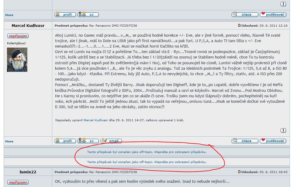 dakujeme za moznost dakovat, a este ako namet ponukam pozriet sa na moznost oznacovat prispevky ako OT, i ked teraz neviem, ci to mozu oznacovat bezni uzivatelia, alebo vedenie fora... vid priloha, ako vyzera OT oznaceny prispevok, kliknutim sa da zobrazit, inac nezavadzia... odkaz: stvrty a piaty prispevok zdola