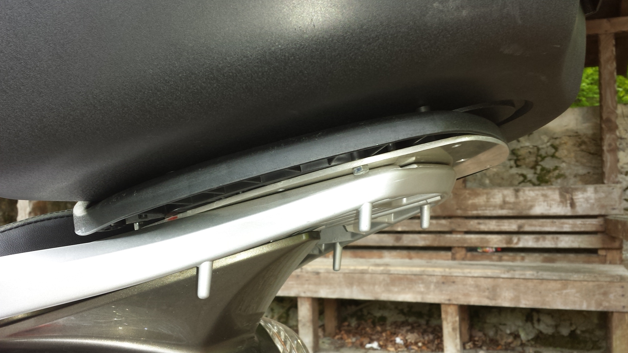 Doska kufra je primontovana na nerezovy medzikus a ten do original dier na nosic Hermiony. Montaz realizoval Mucow. Este pridu brzdove ledky...