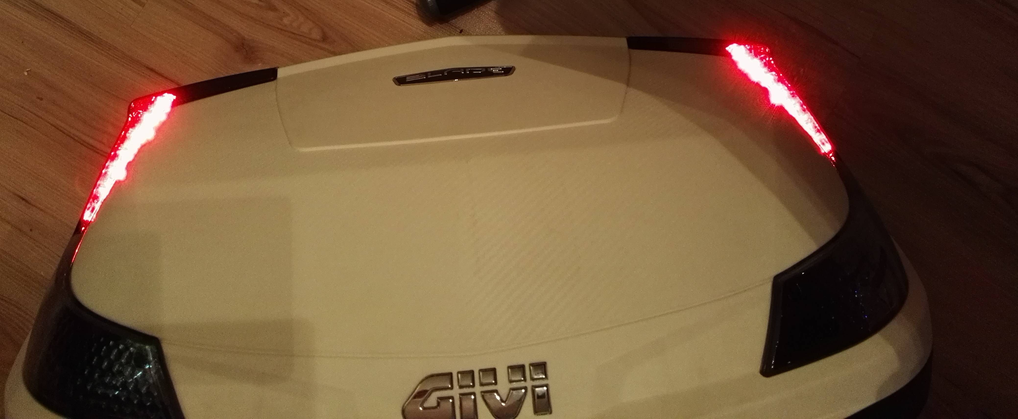 Takto to vyzerá zapojené. Samotné svetlá vedia svietiť dvomi intenzitami. Škoda len, že konektor medzi skútrom a kufrom má len 2 poly. Hneď by som zapojil aj svietenie koncových svetiel.
