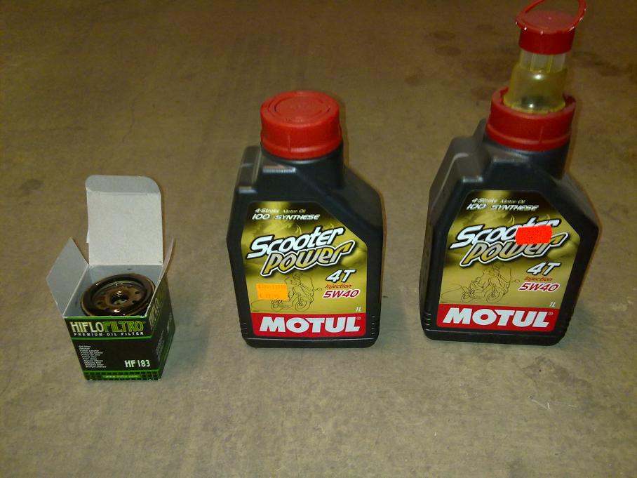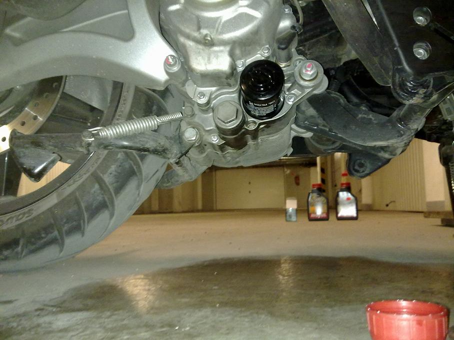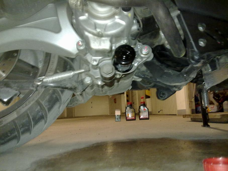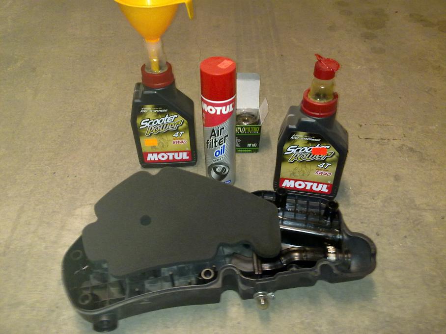 Koleno výfuku vidno vpravo hore. Filter je priestorovo viac v strede skútra, výfuk ide obrysovo úplne zvonka. Preto sa pri pohľade z boku z diaľky zdá, že sa prekrývajú. Viac mi pri výmene oleja zavadzal hlavný stojan, ako výfuk. Zle sa tam manipulovalo pri povoľovaní tej veľkej skrtuky pod fitrom. Inak okrem toho, že je to vypúšťací otvor, tak tam je ďalší, tvz. hrubý filter oleja. Čiže olejové filtre to má dva.