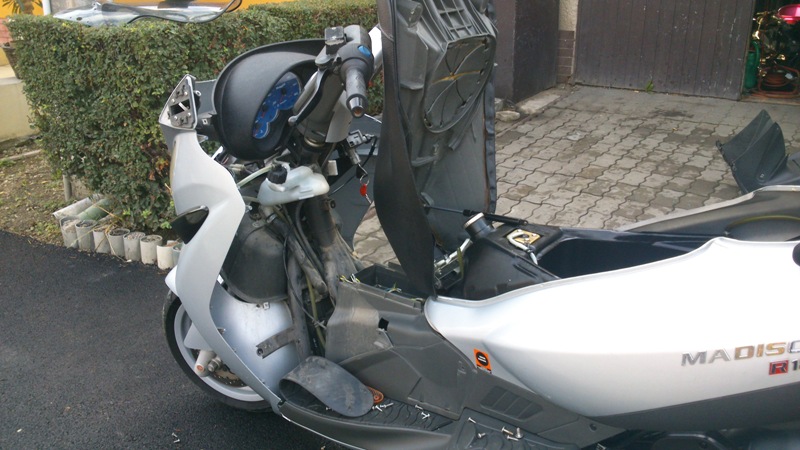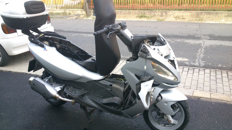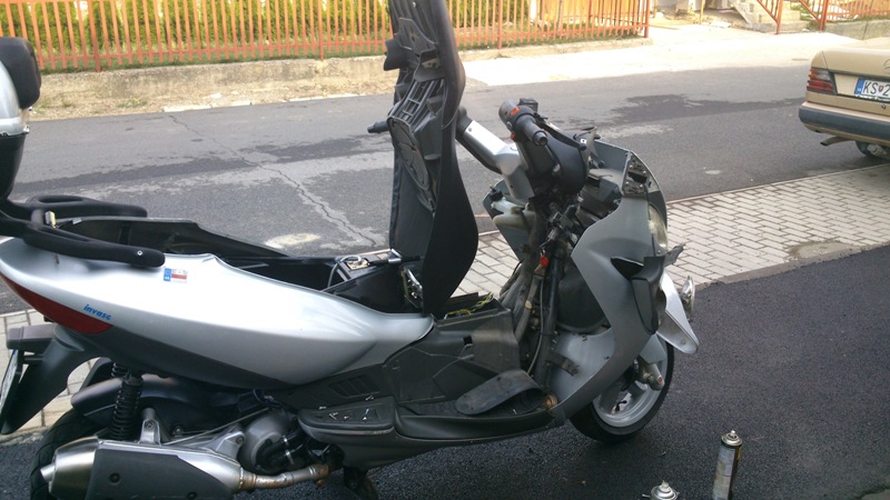 ... dnes som rozhodil komplet predne plasty aby som sa dostal ku spinacke kedze sa nedal otvorit podsedlovy priestor - nakoniec sa moje obavy z nefunkcnej poskodenej spinacky nepotvrdili - bolo to zaoxidovane lanko - po premazani vsetko slape - pri skladani som doplnil chybajuce skrutky a nastavil som vybrujuce spetaky - guta je vylestena z vonku aj z vnutra a nakonzervovana .... foto snad doda Gianmarco - dakujem mu za asistenciu .... koli jednemu lanku som dnes rozhodil vacsiu cast skutra - asi 50 skrutiek - zlaty poldecak ....