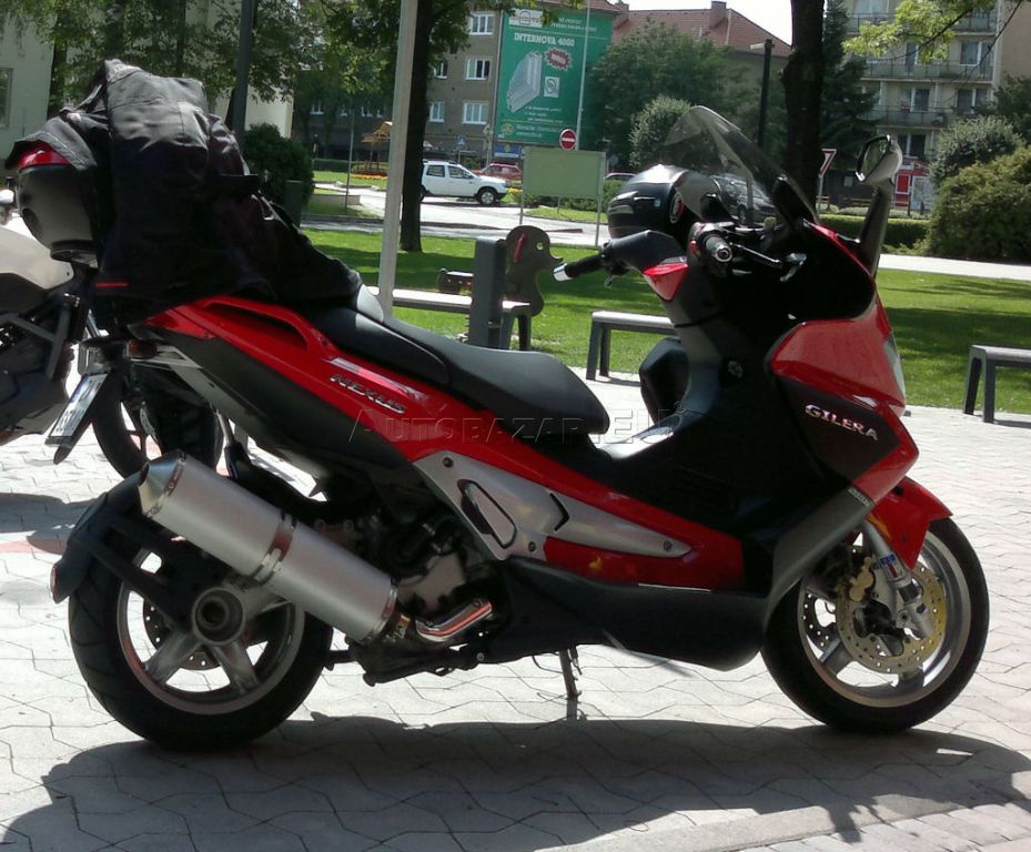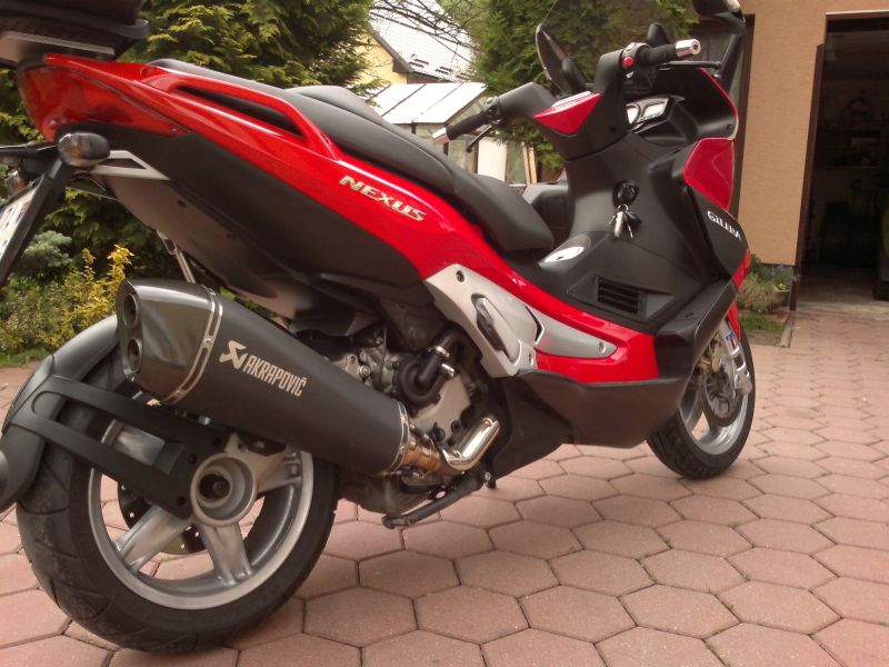 Keďže naposledy som sa tu predstavoval ešte na mojom bývalom skútriku Kymco Grand Dink 250 a odvtedy už prešla nejaká doba a ja som už aj dávnejšie zmenil stroj, predstavím svoju Gileru Nexus 500ie, rok 2005 - pôvodom z Car Care Žilina. Keď som ju bral mala športové plexi malossi, racing spojku Maloosi, vari J Costa, chip tuning a výfuk Akrapovič z Aprilie RSV. Časom som však prehral späť originál SW, pretože som mal dojem že spotreba je príliš vysoká - a je pravda že po aktualizácií klesla spotreba o ca. 0,5l. Stratil som síce výraznejší ťah v stredných otáčkach a aj maximálka (tachometrová) klesla z 178 km/h na 168 km/h. Výfuk Akrapovič som vymenil za Gianneli s certifikátom na tento stroj. Akra bol zvukovo síce niekde inde ale na moju častú jazdu vo večerných hodinách som nemal dobrý pocit cítiac so susedmi. Tento Gianneli je zvukovo lepši ako originál (chvíľu som mal namontovaný aj origo) ale nie zase až moc agresívny.