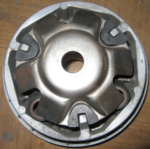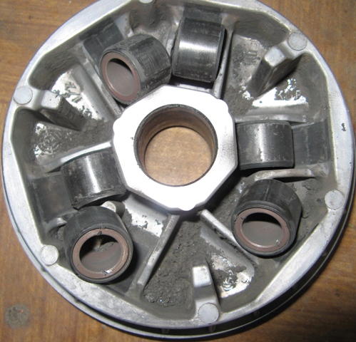 ...alebo to takto nemusi byt vobec, ale inac si neviem predstavit, v akom pripade by tie valceky mohli skoncit v takejto polohe... alebo uz viem: ked ktosi niekedy v minulosti (pripadne pri zostavovani scootra) skladal variator, urobil to nesikovne, a to tak, ze ked nasuval variator na os, ten sa mu pootvoril a valceky povyskocili... potom ho klasika dotiahol a odvtedy chodili valceky nakrivo... aj takto by to mohlo byt, nie?