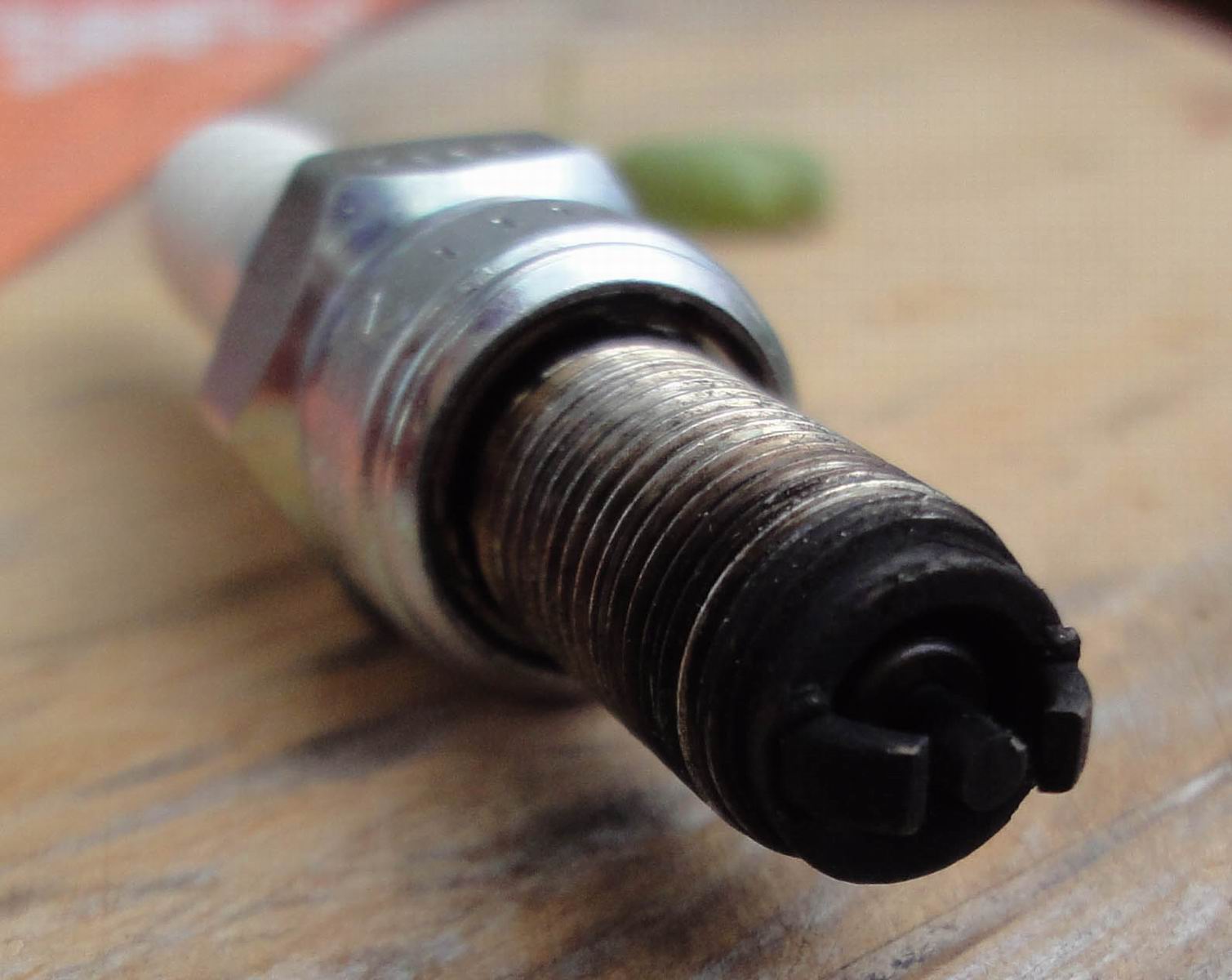 1.) Skontroloval som tú novú a zároveň najteplejšiu sviečku po ubehnutí 50 km. Elektródy komplet začiernené, izolátor mierne začadený. Sviečku som následne trochu očistil od hrubých nánosov (zostala čierna).