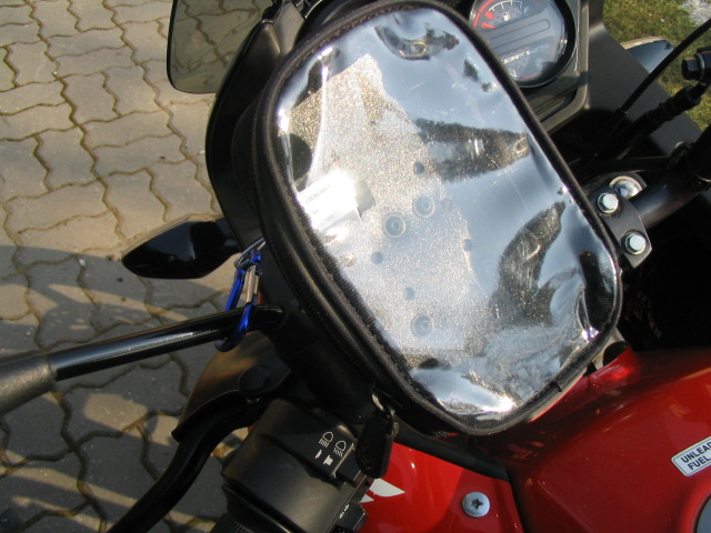 2. Už minulý rok som používal GPS aj s držiakom, ale pár krát som mal problém keď začalo pršať, musel som GPS schovať alebo neskôr som si naň dával euroobal. Toto riešenie nebolo dobré tak som zainvestoval do nepremokavého púzdra (11 €). Púzdro som pripevnil napevno k pôvodnému držiaku, ktorý mal pár múch. Teraz to drží všetko pevne.