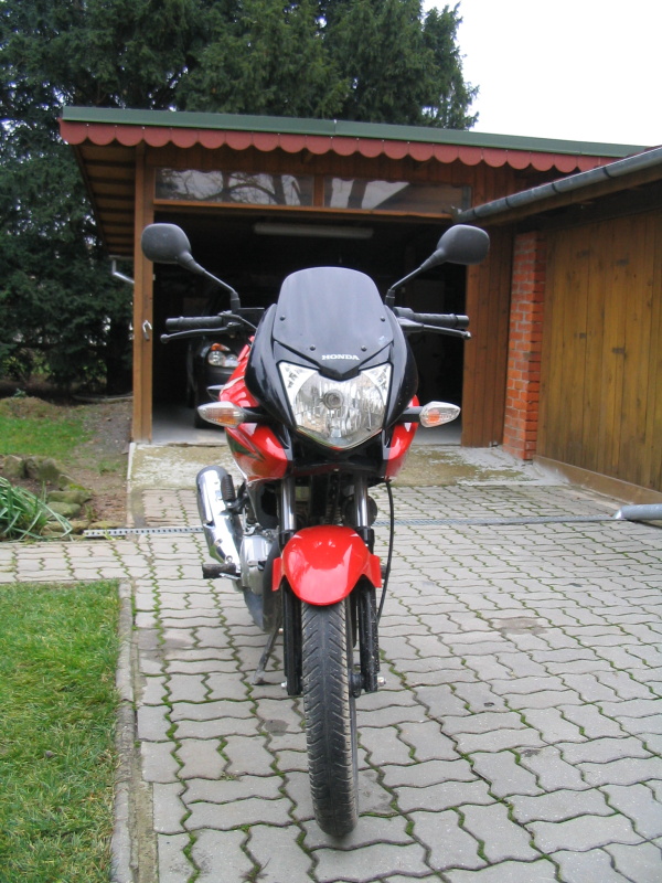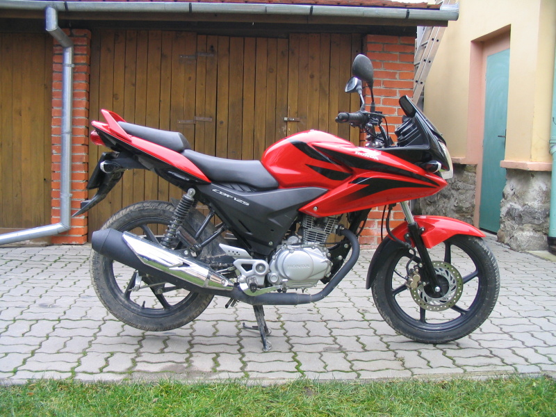 Predstavujem vám moju novú Hondu CBF 125. Nakoniec sa všetko podarilo a dnes som si ju dovoezol zo Svätého Jura. Motorka bola kupovaná v júni tohoto roku a preto som sa nakoniec rozhodol pre túto motorku, lebo je ešte v záruke. Pôvodne som chcel nejakého maxiskútra, dokonca som mal už vyhliadnutého nexusa 500 v čechách ale cena aj keď bola dobrá v prepočte asi 3 000 € bola nad moje možnosti. Potom som nečakane objavil túto ponuku a bola podľa mňa za dobrú cenu 1 400 €. Je síce padnutá na jednej strane ale odniesla si to iba smerovka a bočný plast je oškretý. Myslím že to nebude problém opraviť. Ešte som zistil že je zlomené zadné svetlo takže trochu hrkoce , ale aj to nejak vyriešim. Týmto určite neopúšťam rady skútristov, samozrejme zo všetkými čo sa stretávama v okolí ZM sa budem veľmi rád stretávať aj naďalej a jedného dňa by som sa rád vrátil k tomu čo som mal vysnívané.