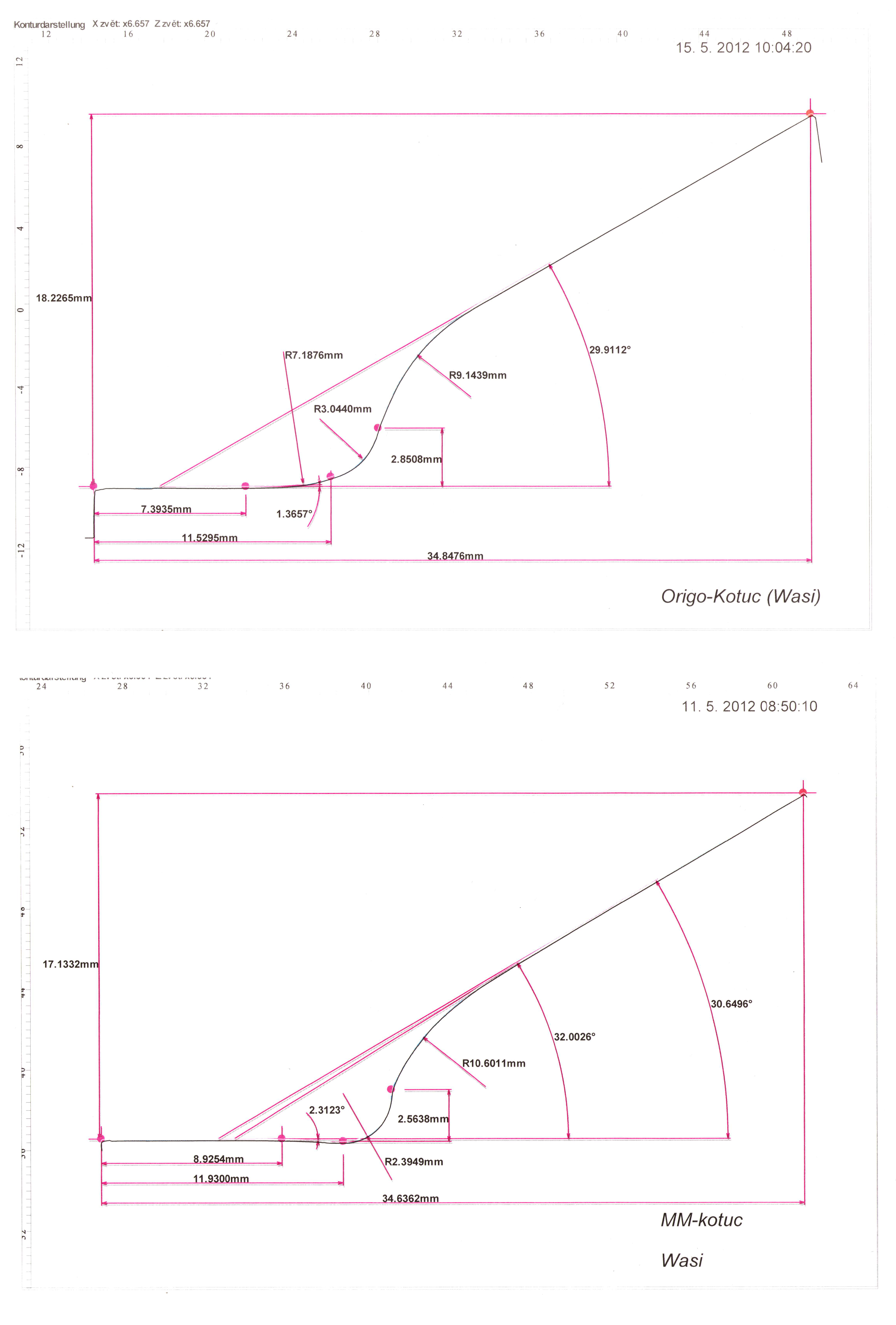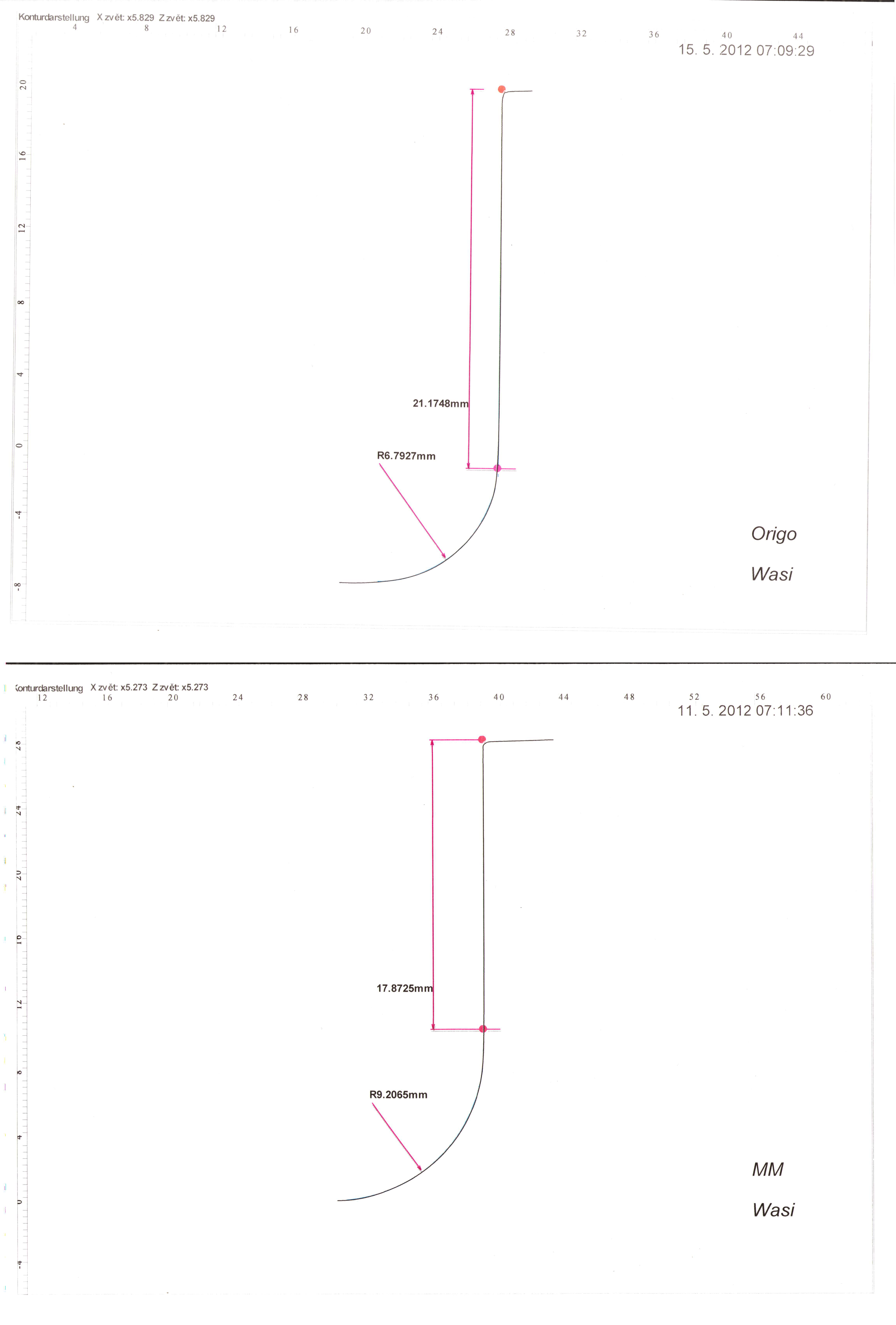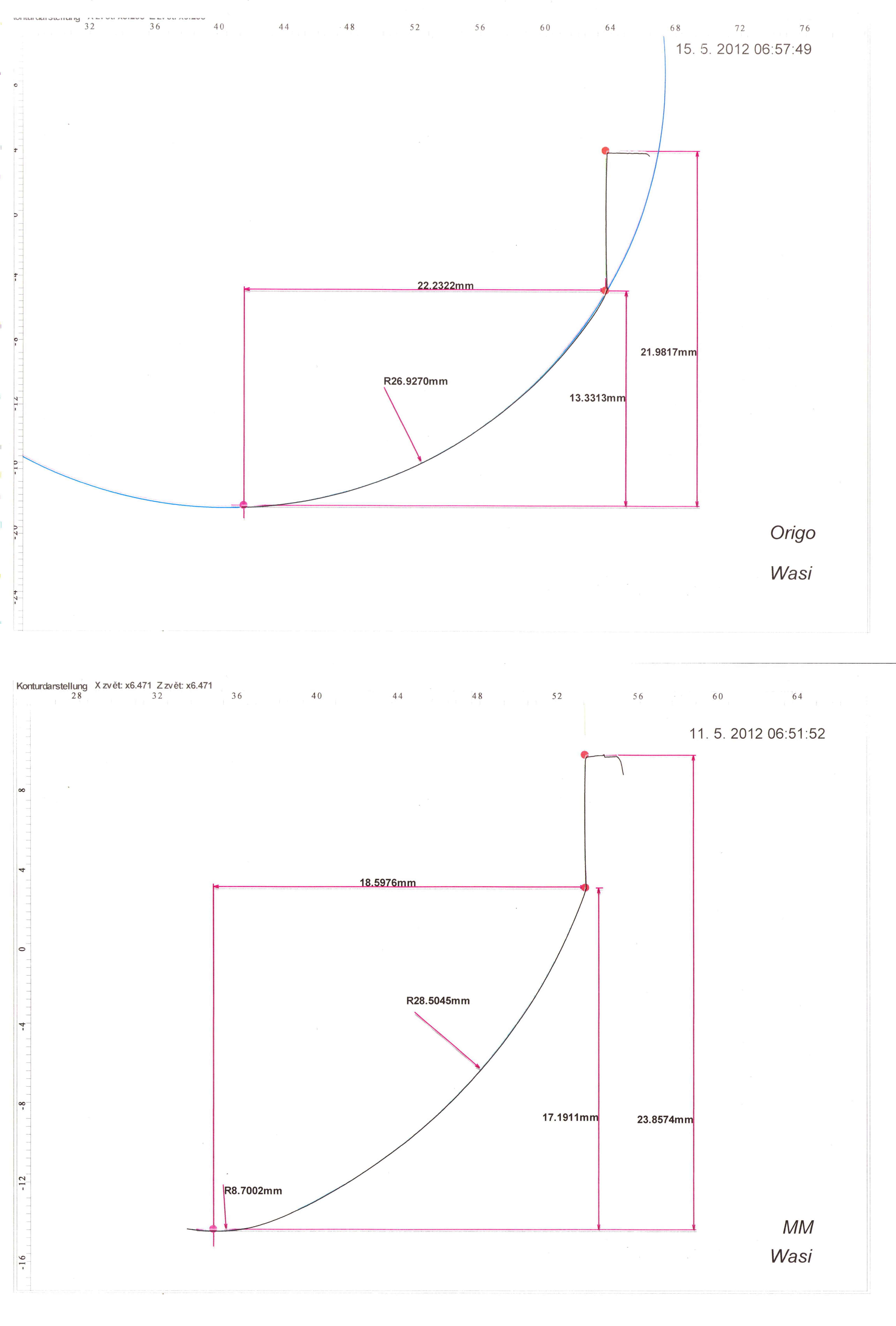 Zakladny uhol variatora z vonkajsej strany+maly priemer-(vlastne by to malo mat vplyv na rozbeh). Aktivna cast drahy valcekov-ktora odtlaca variator v zavyslosti na otackach=pekne vidno ze Multivar dokaze vytlacit valceky vyssie,ale zas je to na ukor hrubky steny, ktoru vidno hore iba opticky...+Multivar ma akesi ulozisko v spodnej casti, zatial co v origo je prechod plynuly. Pasivna cast drahy valcekov-k stedu osi otacania.Meraci pristroj mi nezameral celu drahu valcekov preto je rozdelena do 2 casti(aj tu je vidno rozdiely) Fixny kotuc ktory priamo pracuje pri odtlacani variatora ma asi najviac rozdielov Posledne su drsnosti na zakladnom uhle o ktory sa trie remen. Samozrejme ze pouzivany ma lepsiu drsnost dlhodobym vplyvom trenia remena, ale MM ma podla grafu krasnu rovnomernu drsnost oproti originalu ktory je uz "kostrbaty"..Takisto je zaujimavy pohlad na posledne 2 grafy, ktore su vlastne jeden a ten isty, len je rozdiel zobrazenia. Po cca 7000km vydrel remen 2 rigoly jeden v lavo k osi variatora (pohynanie), druhy v pravo = max rychlosti.Nerovnost tam tvori cca 0,016mm (sorry za velke subory)