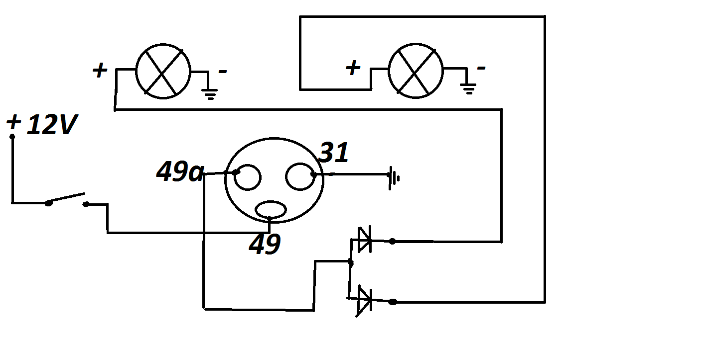 Celé zle...hentak by to vybíjalo baterku. Ak to chceš zapojiť tak ako si písal že aby Ti to išlo aj bez kľúčika v zapalku ,tak musíš to urobiť tak že tú kostru na 31 na nový prerušovač necháš tak ako je na schéme, tú 49a z prerušovača dáš napriamo cez tie diody na žiarovky že tam nebude to tlačítko- spínač . A ten tlačítko spínač napojíš do plusky trvalej od baterky ale tesne za baterku dáš pre istotu dajakú poistku (aby si to nové vedenie mal istené pri dajakom skrate ti nezhorel celý scooter lebo baterka je sviňa a prúdu dá doblba že až roztopí izoláciu a rozžeraví samotný vodič a žeravý drát a roztopená izolácia je možno aj oheň a k tomu benzín a olej a plasty na scootri a hneď máš takové viď obrázok:) a privedieš na 49. A samozrejme pôvodné smerovky a prerušič necháš v stave ako to je teraz. A toto tam len dorobíš . A teda pôvodné bude fungovať za jazdy tak ako doteraz a tento nový len na výstražné .