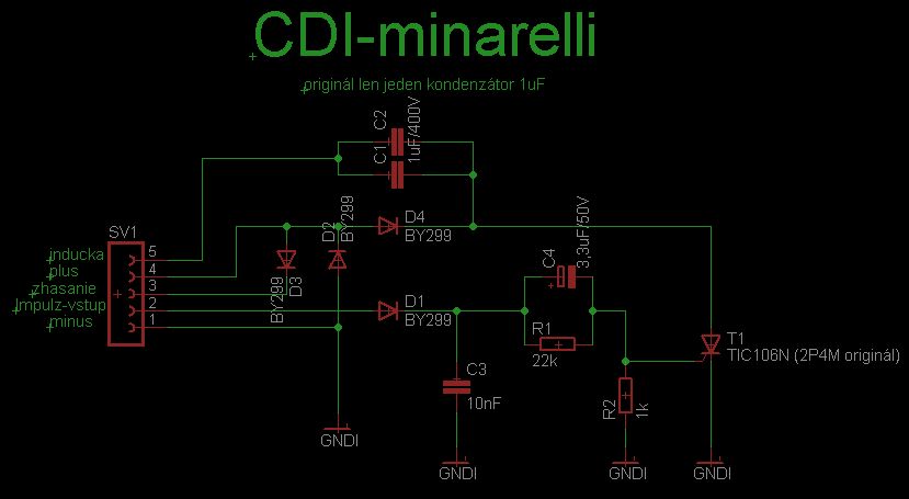 . Jeden tyristor, štyri diódy, dva rezistory a tri kondenzátory. Je to vlastne trochu doplnené babetové zapaľovanie. Vymenil som prerazený zvitkový kondenzátor za nový (cena 1 euro) a CDI funguje ako má.