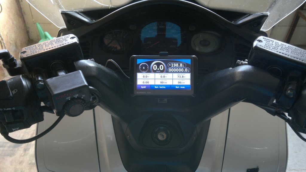 Držiak je origo Garmin, ja som len vyplnil ten stred gumou, myslím, že z hokejového puku som to vtedy vyrezal, alebo tak niečo, lebo tam boli veľké rozdiely v priemere držiaka a stopky zrkadla. No a vďaka tomu som aj získal "vyrovnanie" držiaka voči šikmej stopke zrkadla.