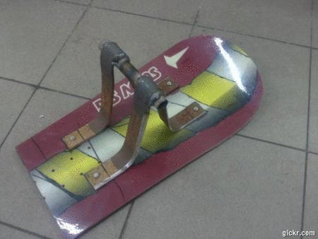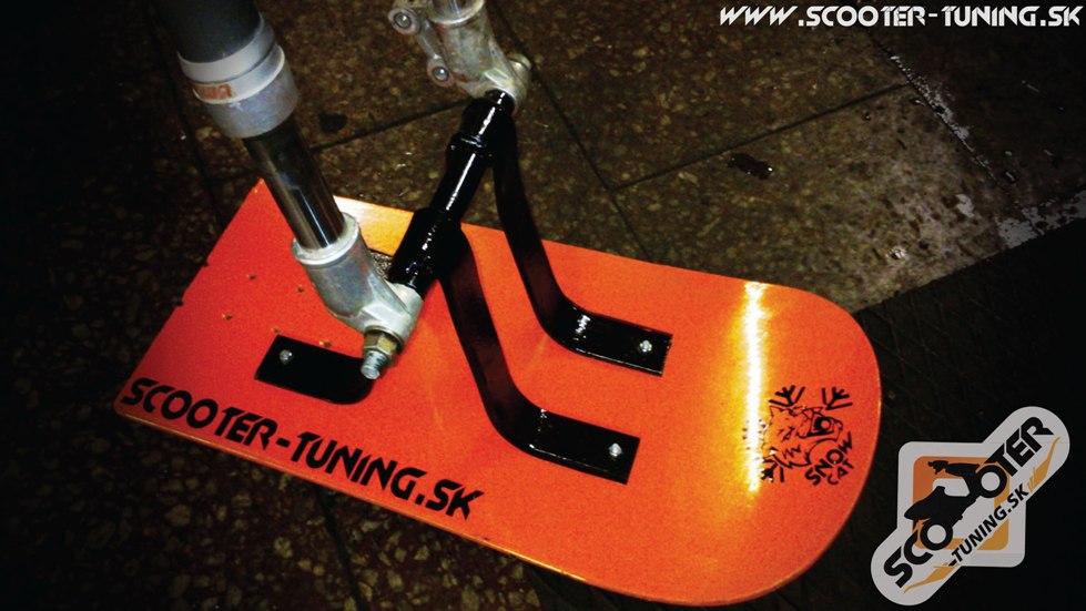 Takže trošku sme sa pohli, prikladam obrazok zvarenej konštrukcie po zvareni a nasledne po uprave a nalakovani. držiak tvorí rúrka ktora má v sebe nalisované klzné vložky na presný priemer osky kolesa, samotne uchyty sú z pásoviny tuším 4mm hrúbka (čo zberne dali). Zatial pracujeme s celou šírkou snowboardu je to robené tak že v pripade potreby vieme zrezať hrany, nachystané sú ešte hliníkové Lkové lišty ktoré budu vodiace. Zajtra by to mal ísť celý skúter do laku